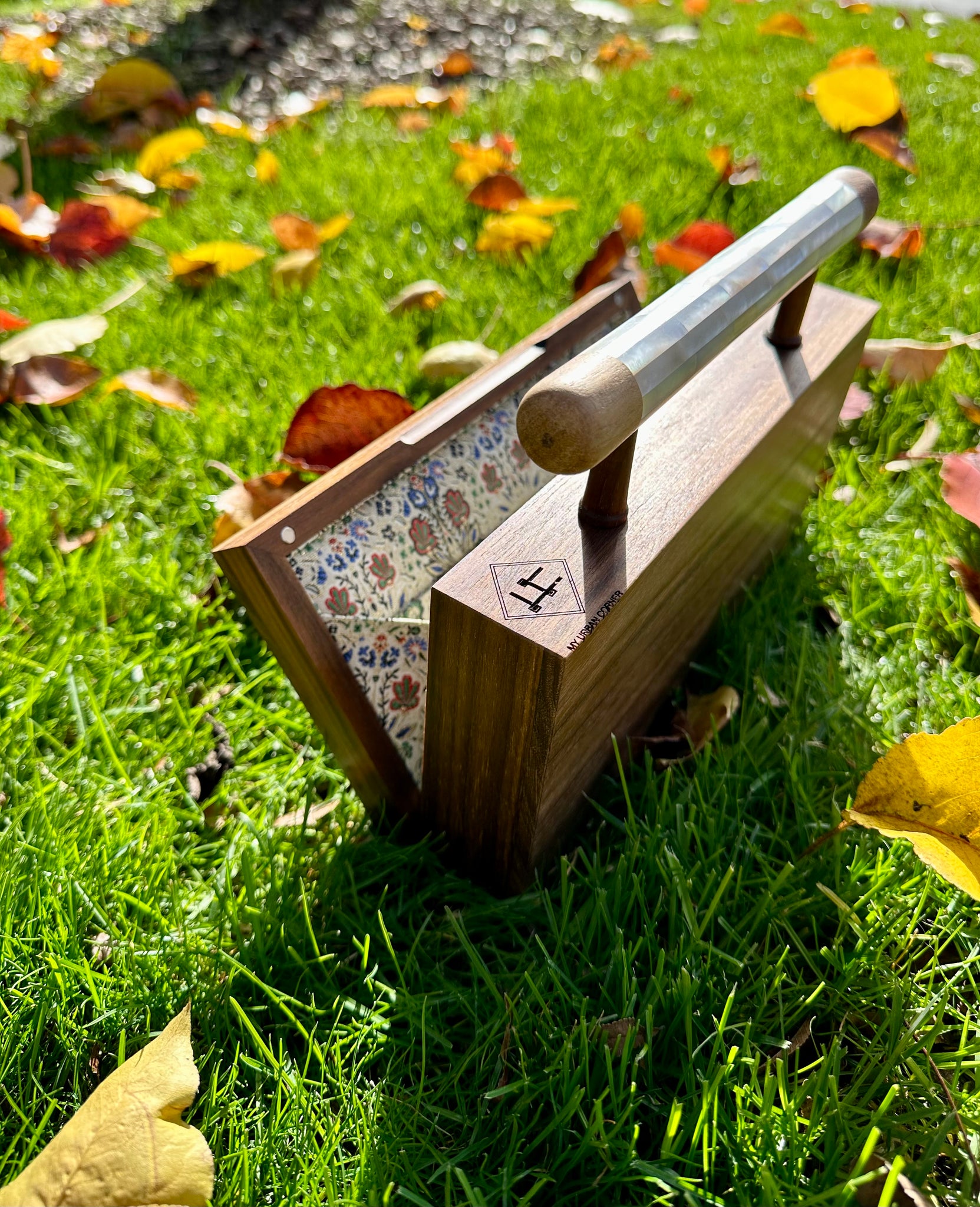 Bag made of walnut wood, hand-carved with the finest mother-of-pearl, and lined inside with Damascus brocade fabric embroidered with qasab and silk threads.